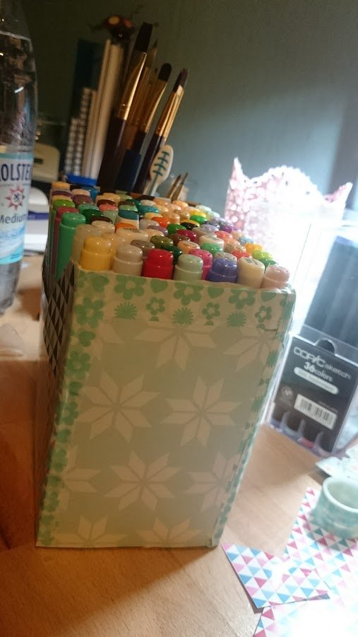 Mein 36er 25th Jubiläumsset habe ich also in diesem Acrylblock Dingsi denn, Copic Sketch nehmen am meisten Platz ein. Also brauchte ich etwas für meine Ciaos in erster Linie. Und da ich noch nicht sooooooo viele habe, suchte ich etwas wo am besten alle “enger” drin STEHEN bleiben. Mein Kater schaute ein wenig perplex als ich die Box seines Essens genommen hatte. So, der Korpus war schon mal da und ich werkelte etwas mit den Stiften wie man sie aufstellen, hinstellen etc kann. Nun ist es leider so das aber meine Stifte noch nicht den Kompletten Karton ausfüllten.